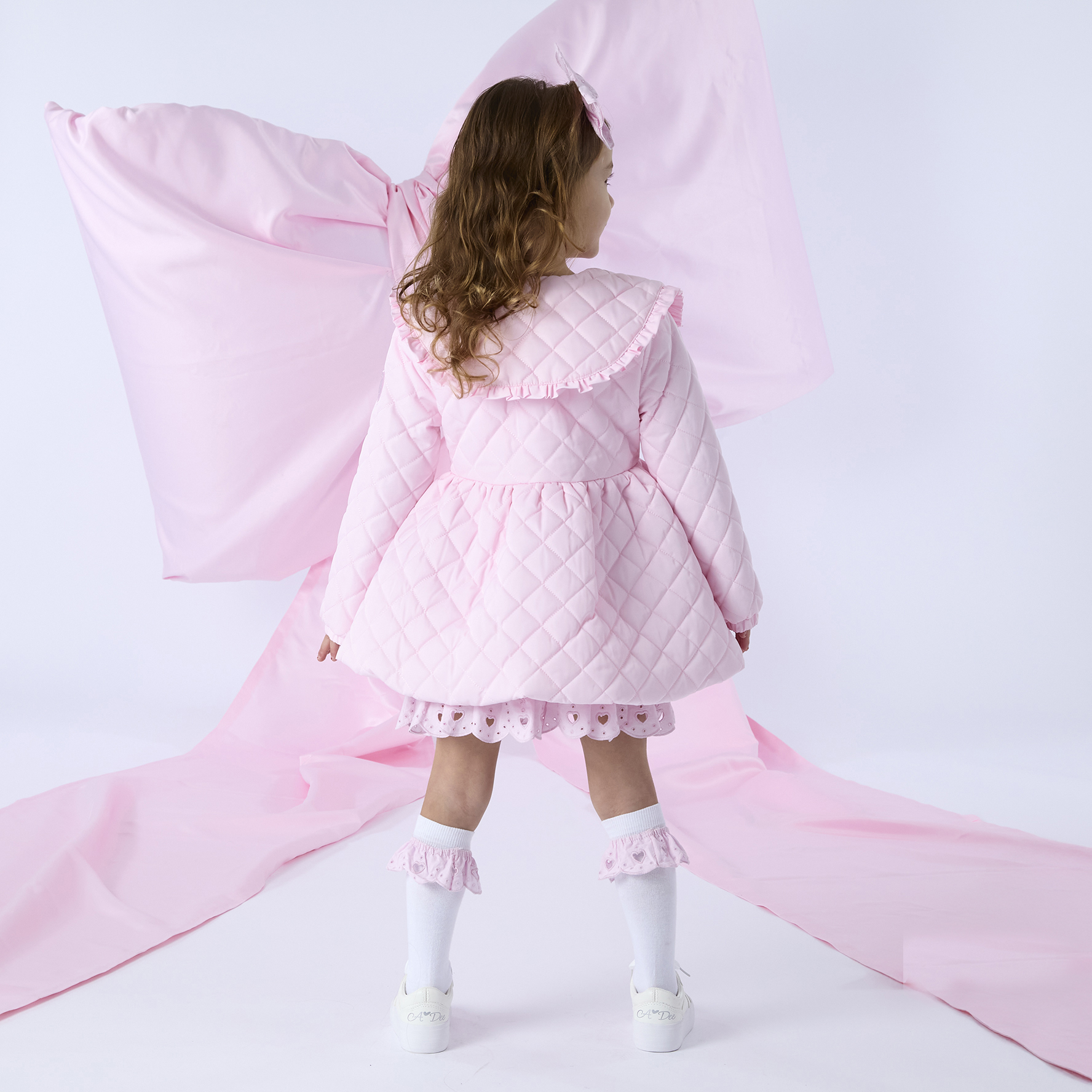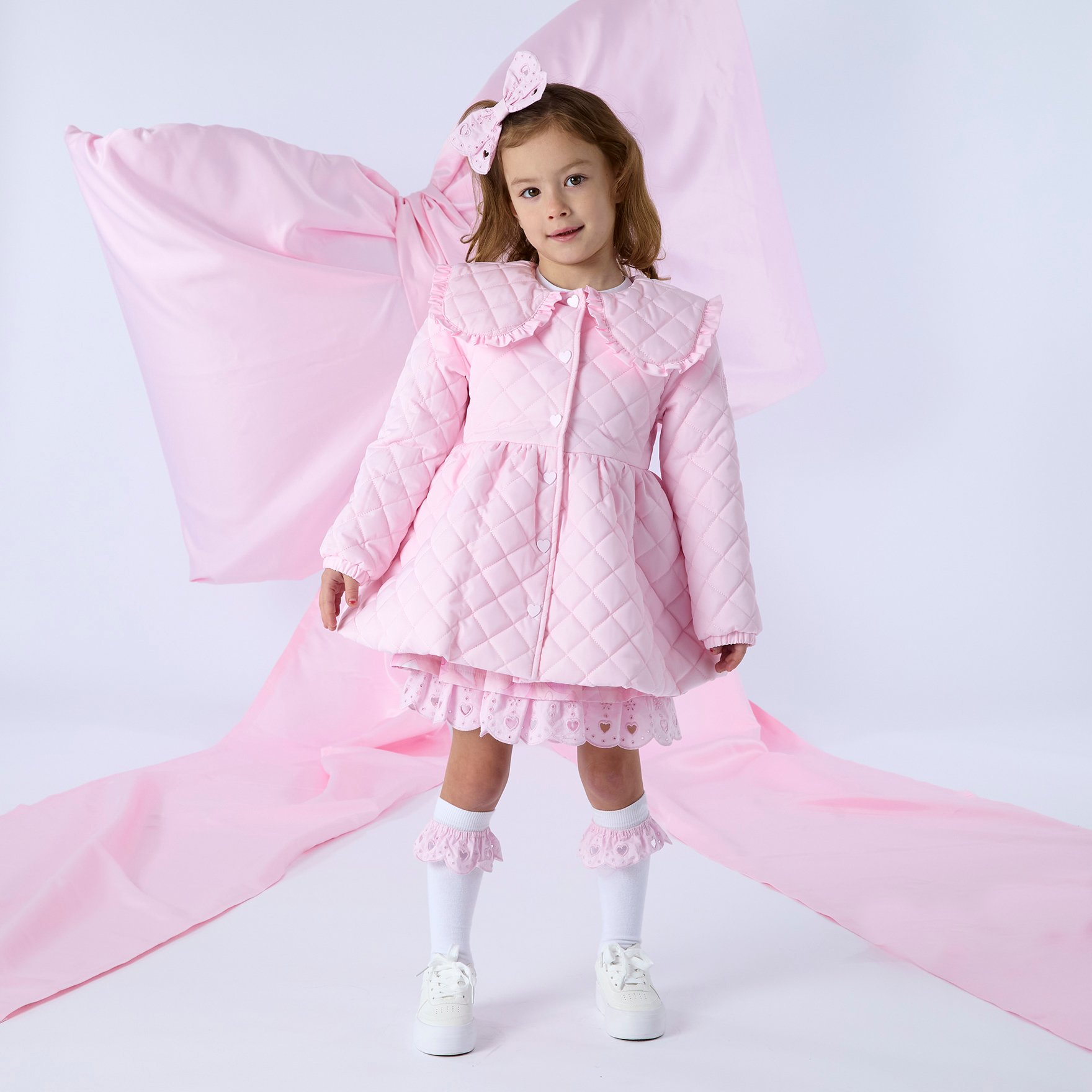 The Riley quilted jacket is made with silky polyester and features a beautiful frilly collar. Finished with heart shaped buttons and logo badge on one arm.
