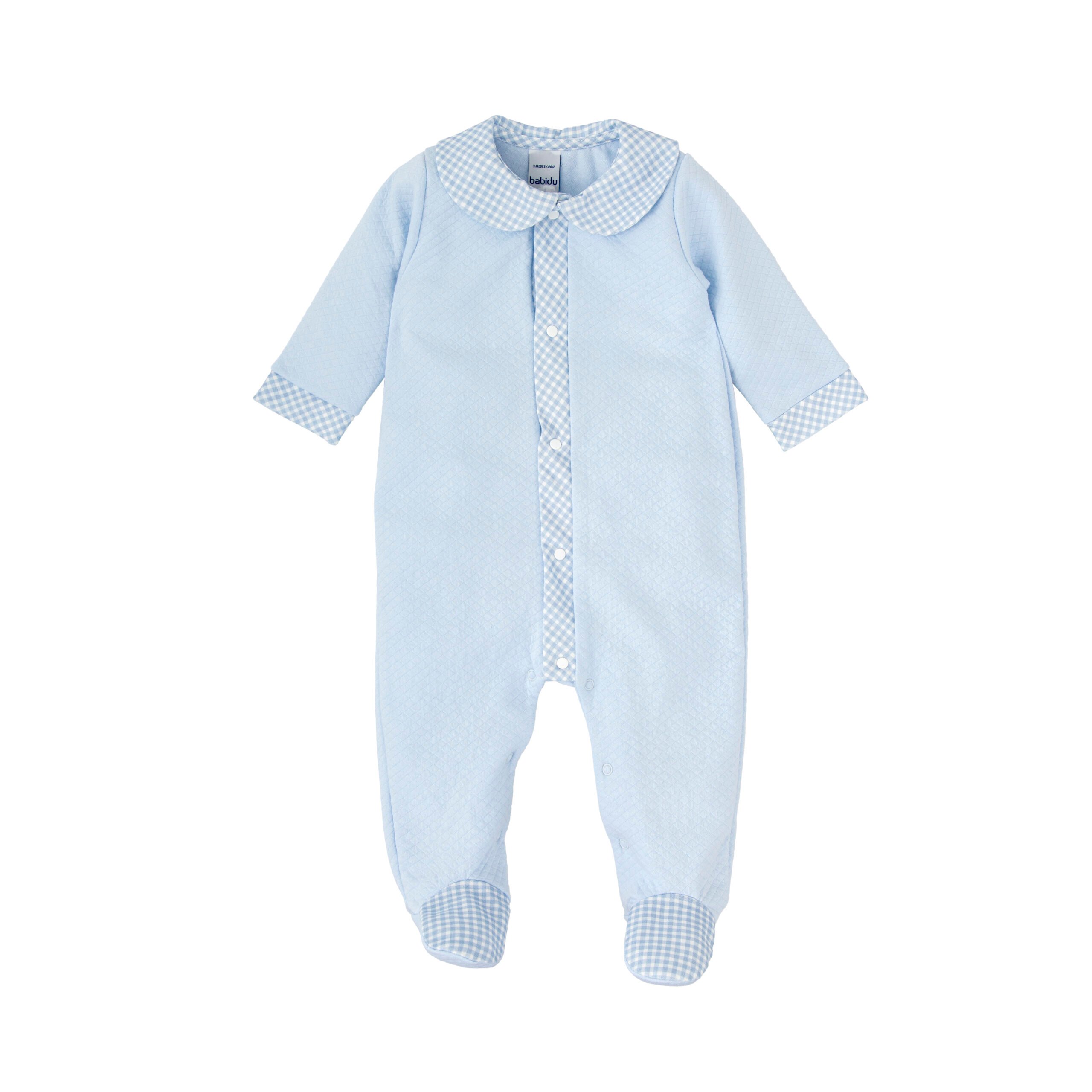 Pale blue with cute gingham trims, this lovely Babidu babygrow for boys and girls is made in soft cotton jersey with a fine diamond pattern. It features a sweet rounded collar and fastens with poppers on the front and between the legs for quick and easy changing.