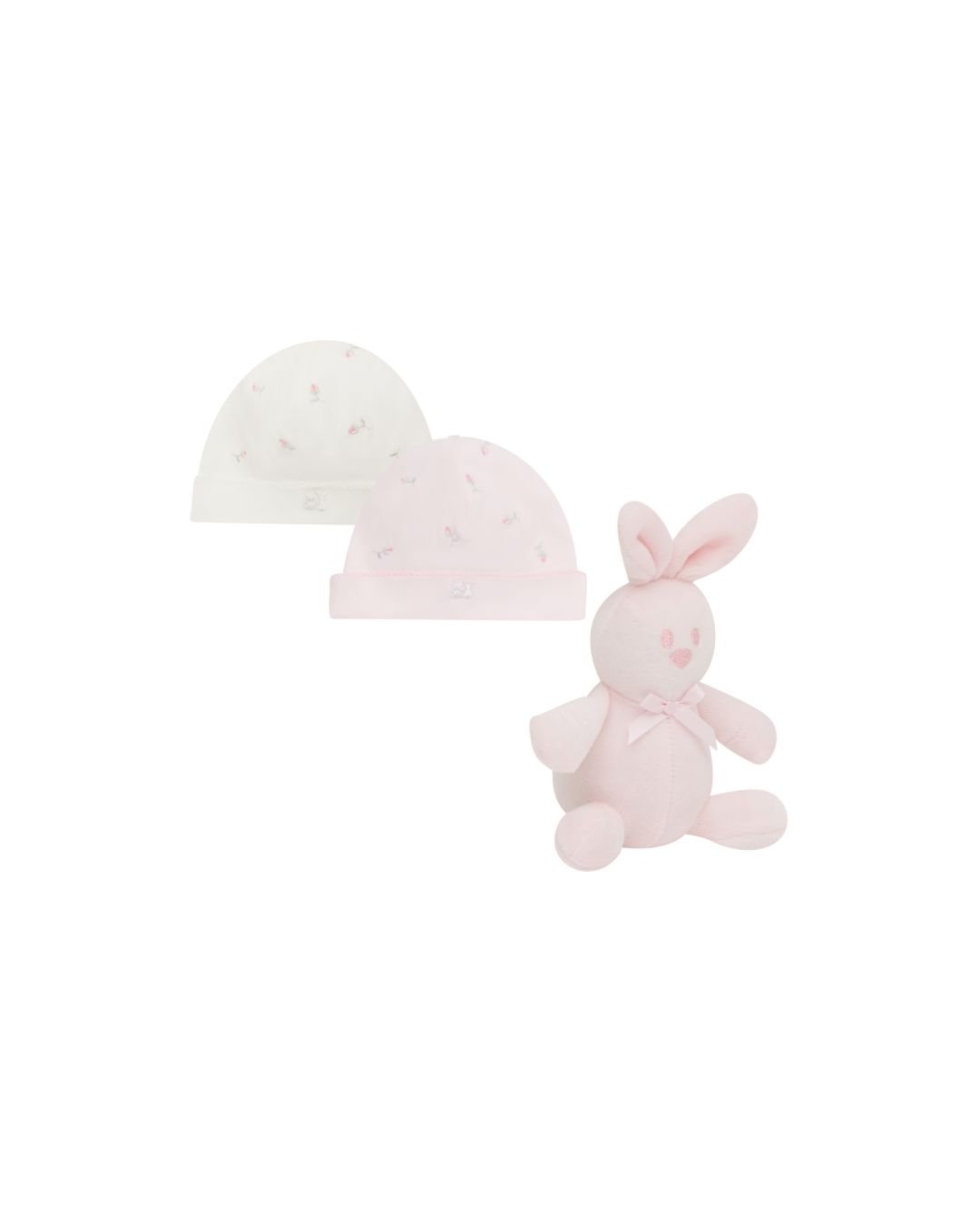 New for this season, Linzi is a lovely new baby girl, affordable gift set. It contains our popular pull-on baby hats, one pink and one white, with gorgeous rosebud embroideries and our super cute Rose bunny. All beautifully presented in a luxury white presentation box with a clear window adorned with the signature Emile et Rose logo and ribbon detailing. A lovely new baby gift!