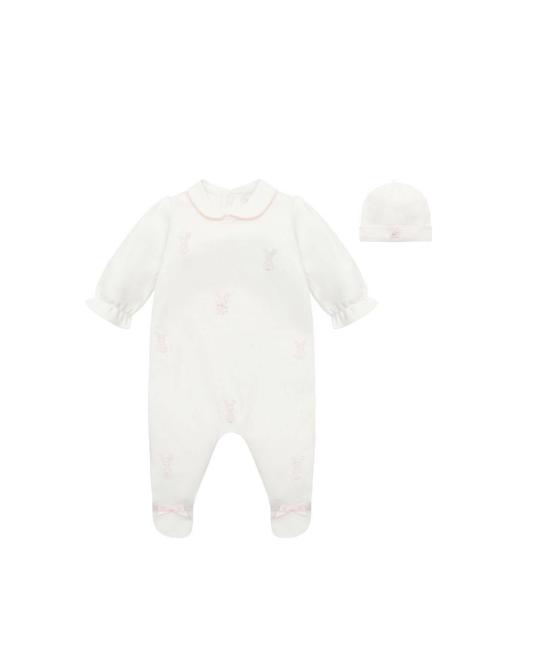 Small embroidered pink bunnies adorn the front of this lovely little white babygrow. Simple in shape, with a neat rounded white collar with pink piped trim, pink satin bows on the feet and a super cute ribbon “bow-tie” to the central bunny. This baby girls babygrow is perfect for napping or playing. Also comes with matching pull on hat.