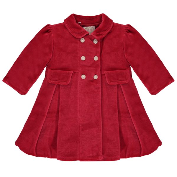 A festive favourite for baby girls’ is this gorgeous red coat. In cosy rich red velour, Rosanna is lightly padded with a mock double-breasted front. The skirt of the coat is a smart shape with fullness from the pleats that fall from the waistline. Perfect for winter walks or special occasions this baby girls’ coat is complete with a matching baby beret.