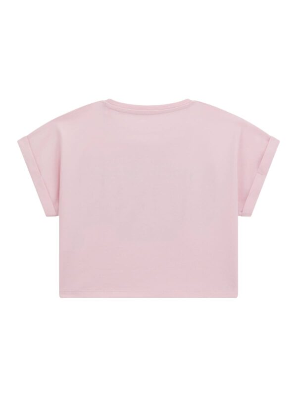 Pink cotton T-shirt by Guess, designed in a stylish boxy fit. This soft jersey top features a shimmery silver, green and pink sequinned logo on the front for instant designer appeal.