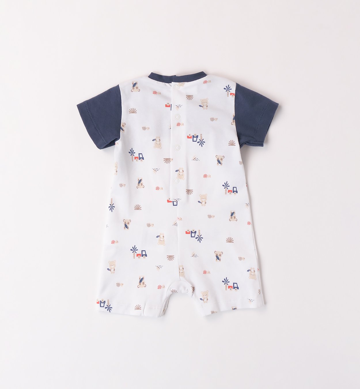 Adorable navy blue and ivory shortie for baby boys by iDO Mini, designed in a one-piece dungaree style with decorative beige straps. Made in soft and stretchy cotton jersey, it has a cute animal and truck pattern in red, blue and beige. It fastens with easy poppers on the back and underneath for ease of dressing.