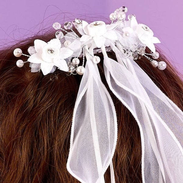 Hair comb with 3D flowers, ribbons and swirls.