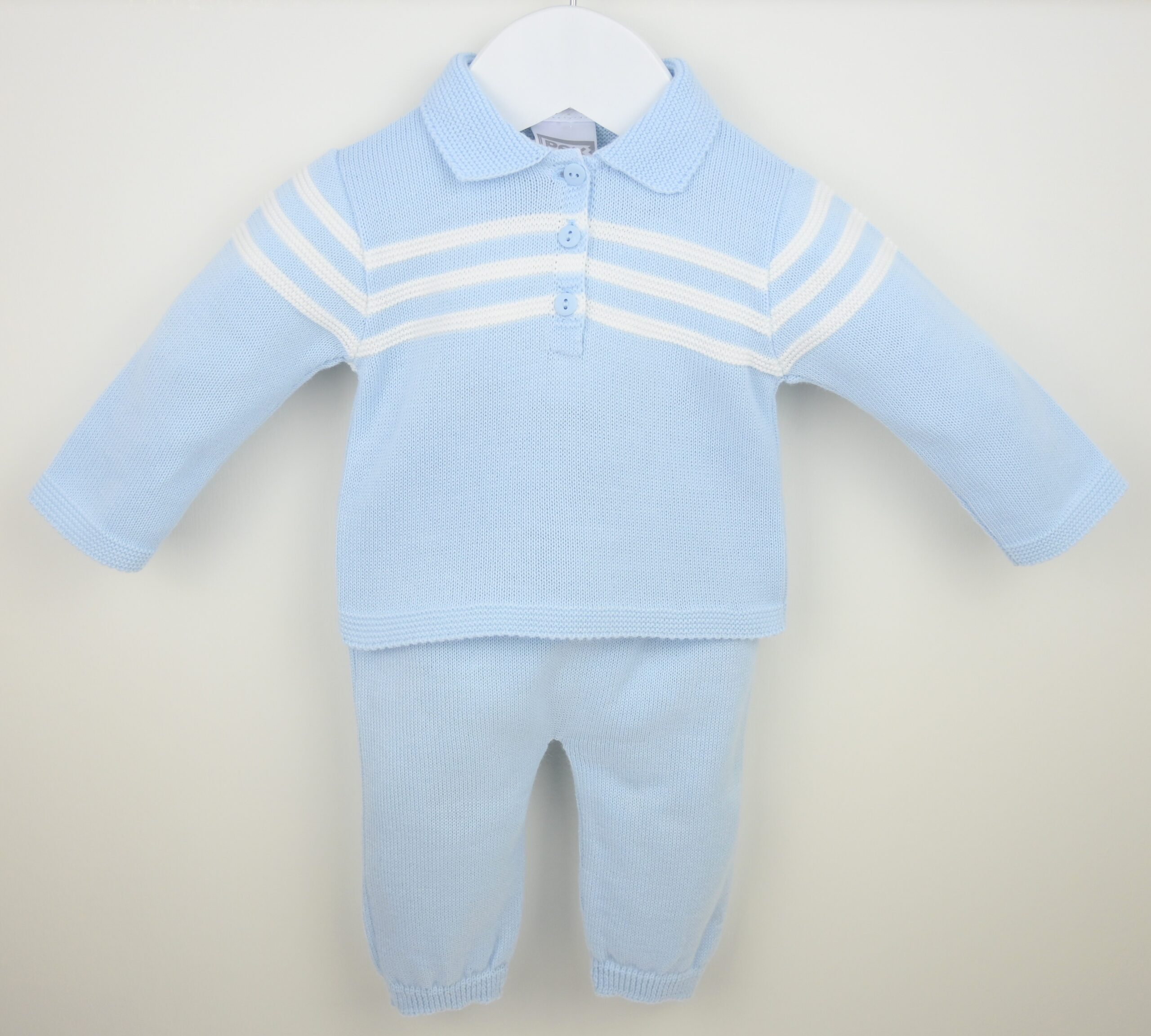 Newborn boy’s two piece outfit from Pex, includes a pair of sky blue knitted bottoms, and a matching blue long sleeve top with a button down collar and white stripes across the shoulders.