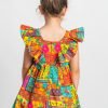 Gorgeous orange dress for girls by Rosalita Senoritas, printed with colourful, summery, Latin-inspired artwork. Made in soft, lightweight cotton sateen, it has statement ruffle trims on the bodice and over the shoulders for a feminine finish. It fastens with a neat, concealed zip on the back.