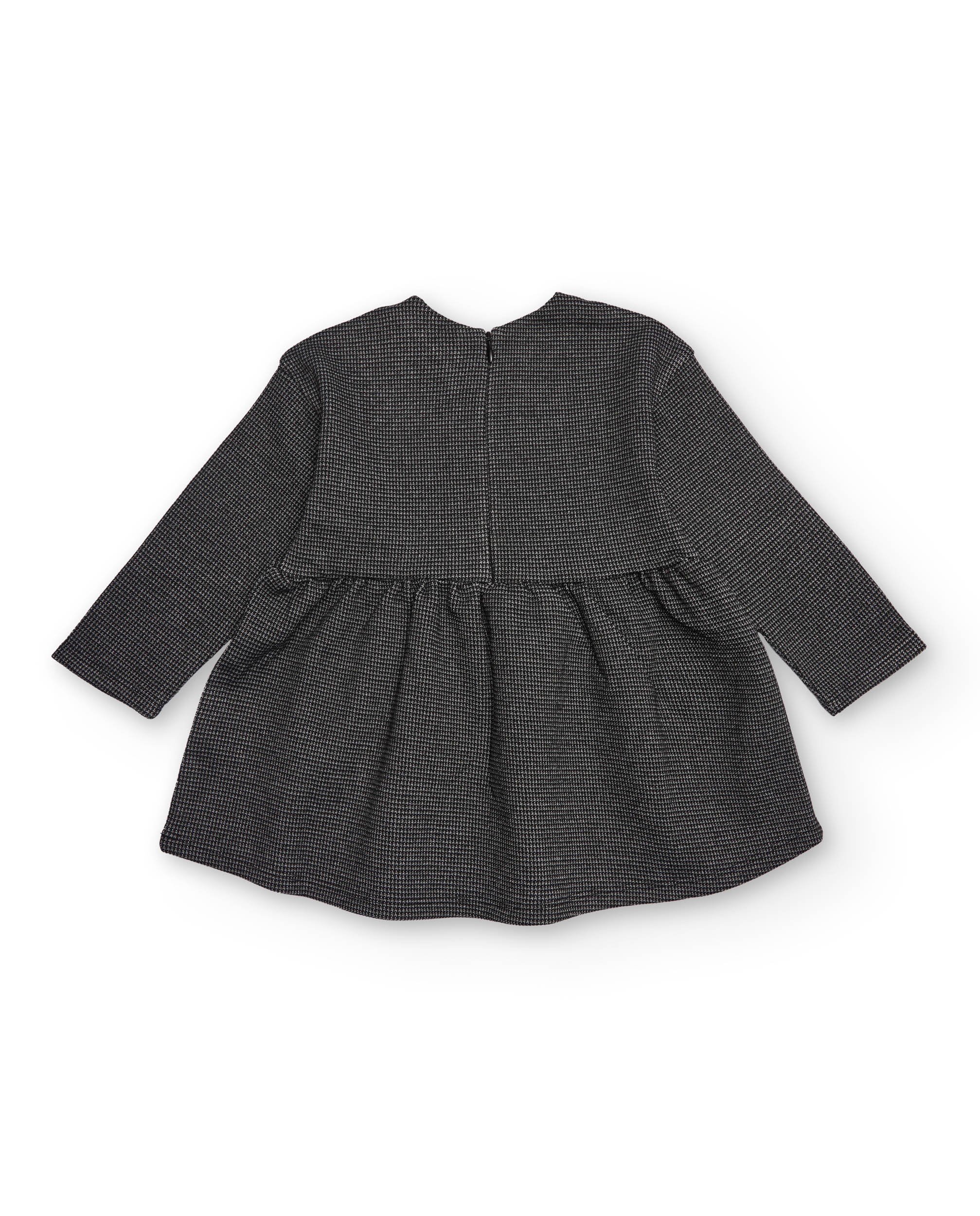 Long-sleeved dress for girls in gray fabric with small checks. It features an A-line design, an invisible zip back closure and a heart detail applied on the front, one of them in fuchsia velvet. A comfortable and stylish garment for everyday wear.