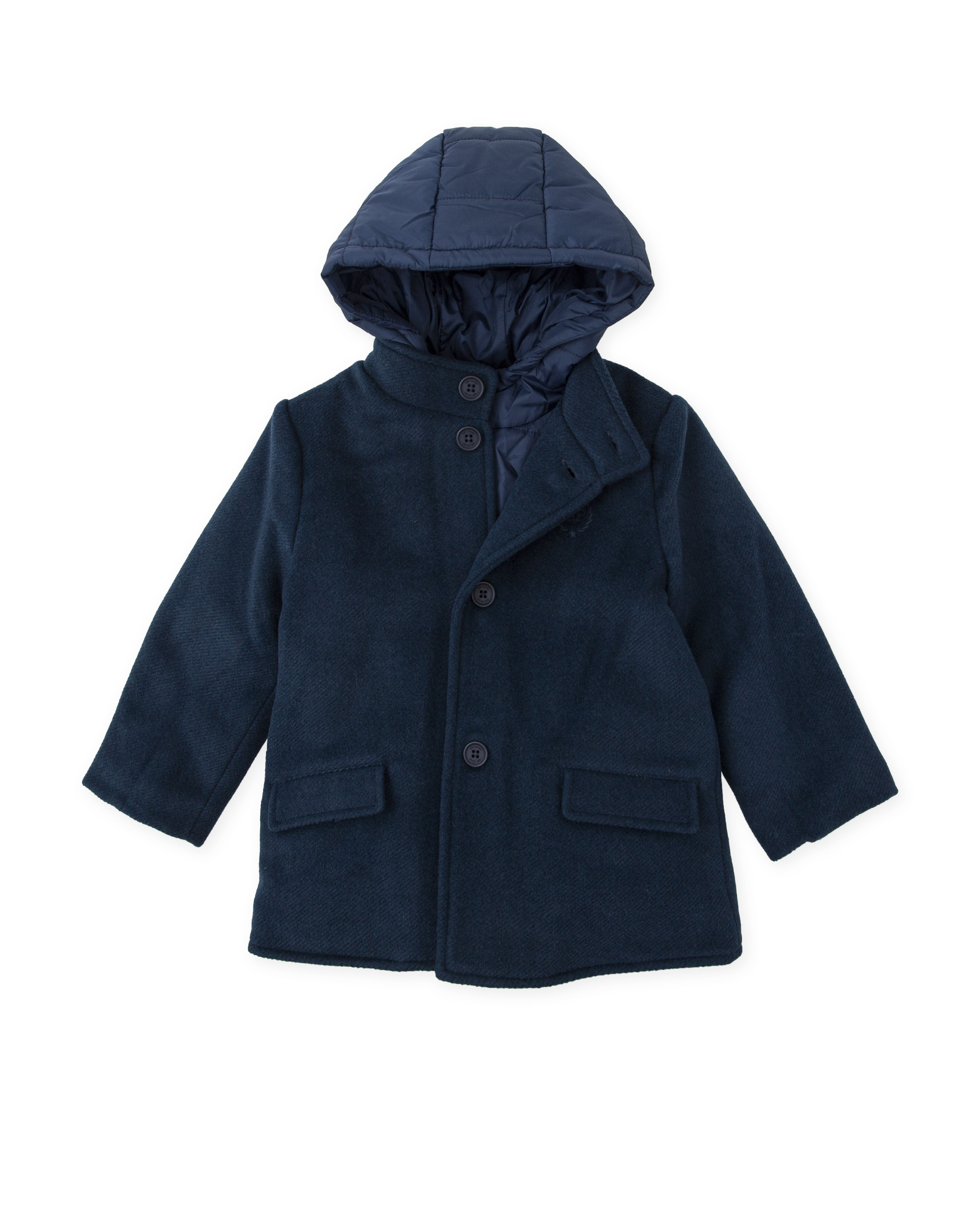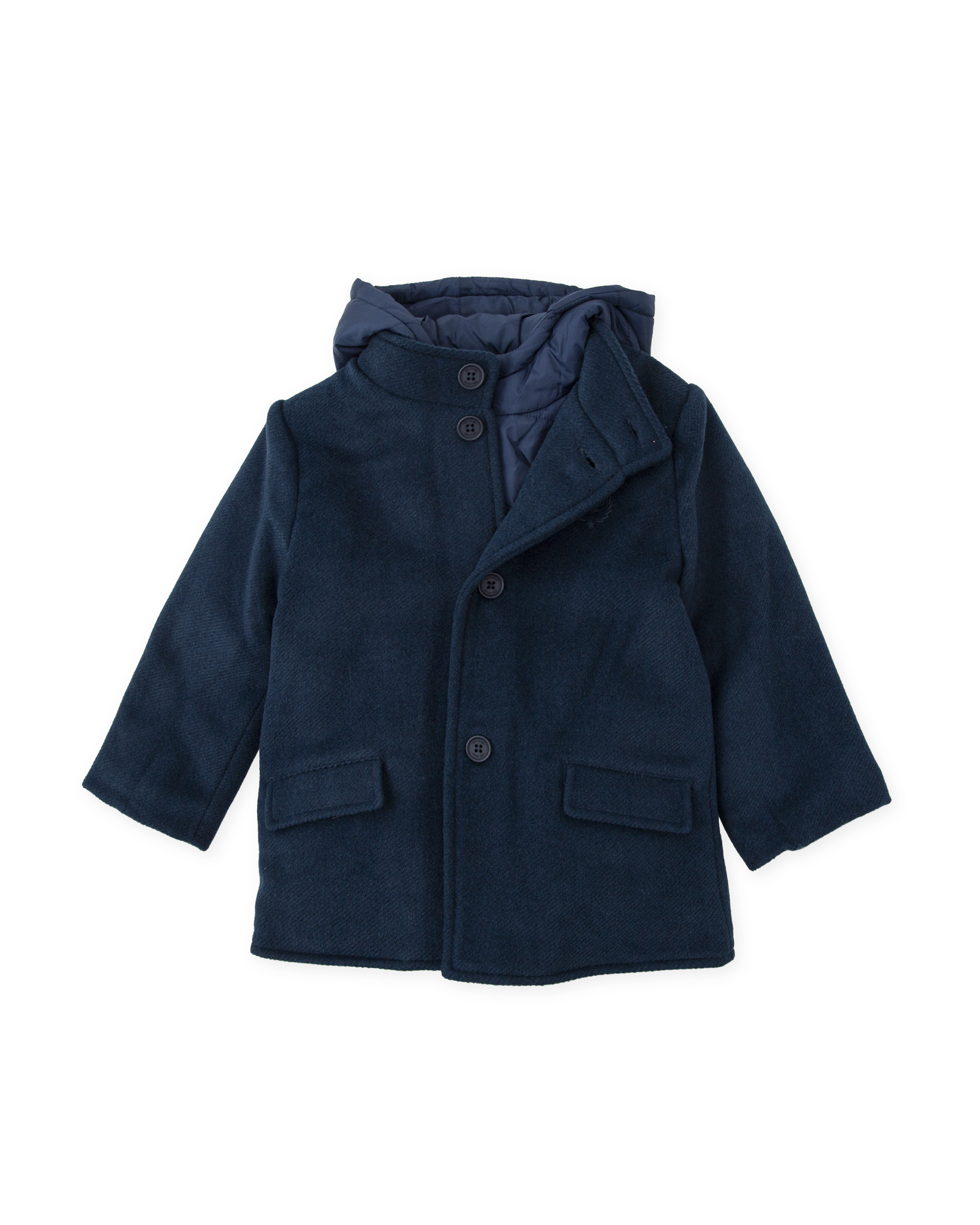 Stylish navy blue coat for boys by Spanish brand, Tutto Piccolo, made soft felted fabric with a textured diagonal rib. For a cool, layered look, it has an attached, puffer-style hood and chest insert that fastens wtih a zip. The outer coat has a standup collar, branded button fastenings and flap pockets. A tonal embroidered logo on the chest adds a discreet branded touch.